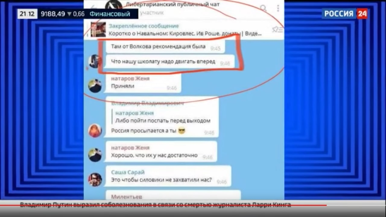 Эфир канала Россия-24 привлёк наше внимание интересным скриншотом. Закадровый голос повествует, что «в telegram появились сливы из чата так называемых либертарианцев». На картинке в некоем «либертарианском публичном чате» несколько людей обсуждают использование школьников в качестве живого щита.