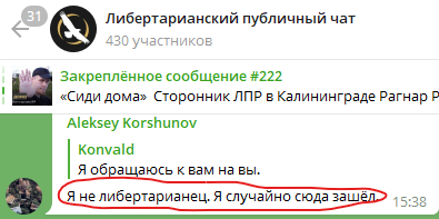 Впрочем, изображение, как и посыл, который оно иллюстрирует — чистая ложь. Слова о «сливе» опровергаются фактом публичности чата со скриншота: любой человек может прочитать сообщения и увидеть его членов, даже не вступая в само сообщество. По этой же причине нельзя говорить и о том, что участники чата либертарианцы: вход свободен для всех желающих, без модерации.