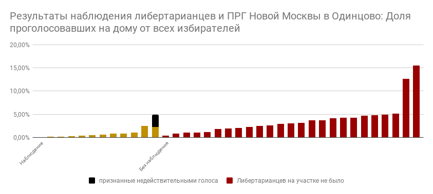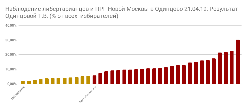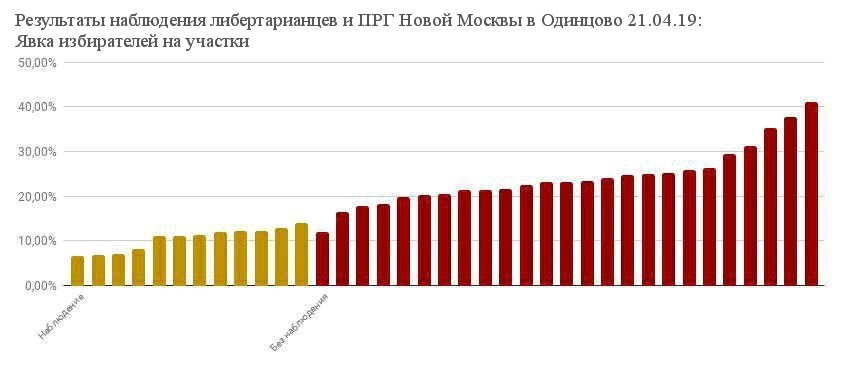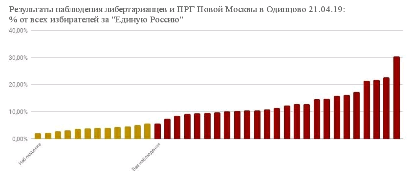 В воскресенье 21 апреля состоялись выборы Совета депутатов Одинцовского городского округа. В одном из избирательных округов наблюдение организовали либертарианцы. Закрыв 12 УИКов, десант из 23 наблюдателей защитил право на участие в выборах 17296 избирателей. Разница в результатах на участках без наблюдения и с ним вышла просто поразительной.