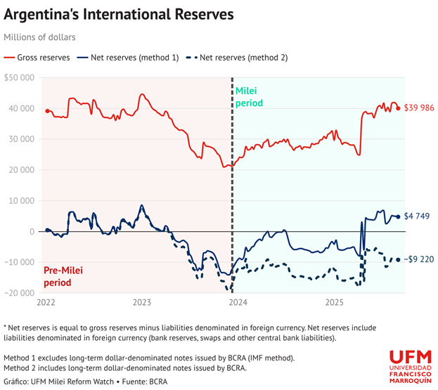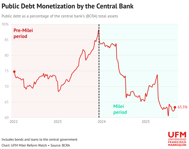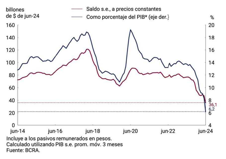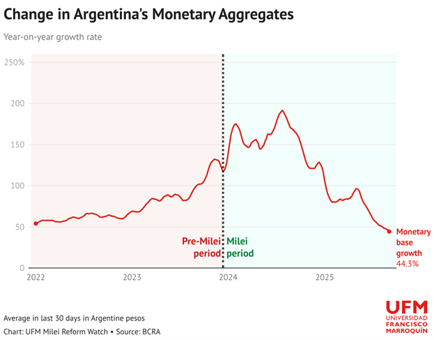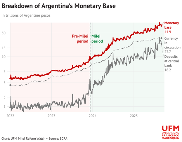 Более того, прямые трансферту в казну не были главной причиной раздутия денежной базы — в основе её лежат в первую очередь покупка иностранной валюты и операции с ценными бумагами, таких как поглощение LEFI. При этом «широкая денежная база», которая помимо банкнот и монет учитывает депозиты национального правительства в ЦБ и выплачиваемые обязательства BCRA (например, Leliqs), в реальном выражении на самом деле сокращается, так как государство планомерно борется с источниками эндогенной инфляции.