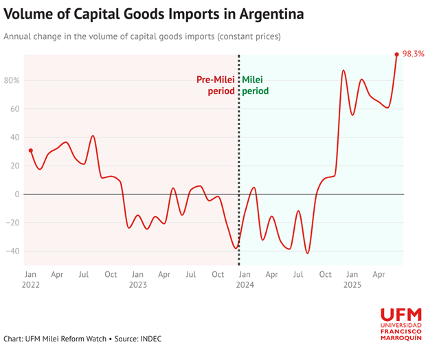 Правительство снизило таможенные пошлины на многие товары и сократило бюрократическую нагрузку на аргентинскую таможенную службу — были снижены или отменены тарифы на более чем 3000 импортных товаров, особенно в производственном секторе и секторе потребительских товаров. По данным Налогового управления Аргентины (AFIP), средний применяемый тариф снизился с 12,2% в 2022 году до 8,1% к первому кварталу 2025 года. Министерство экономики сообщило в марте 2025 года, что неавтоматические импортные лицензии, которые ранее охватывали более 30% всего импорта и задерживали цепочки поставок, теперь требуются менее чем для 10% товаров, что значительно повышает торговую мобильность.