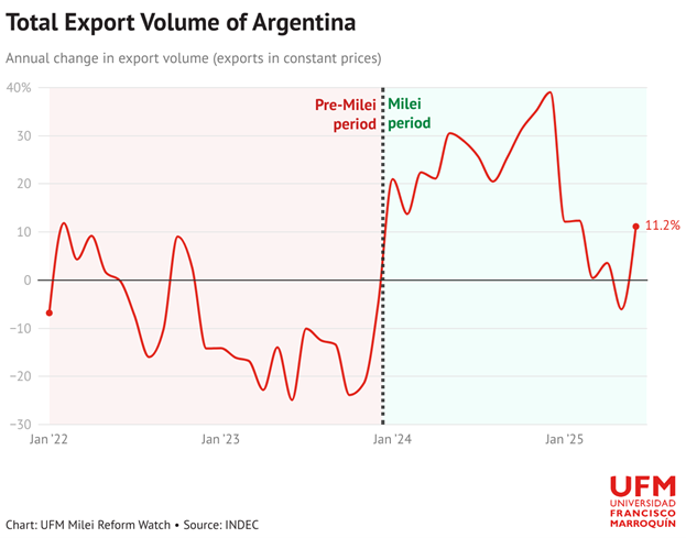 Эти изменения положительно сказались на ключевых экспортных сельскохозяйственных товарах, таких как пшеница, кукуруза и говядина, что привело к усилению стимулов для производства и увеличению валютных поступлений. Зерновая биржа Росарио в марте 2025 года оценила ожидаемый рост экспорта сельскохозяйственной продукции на 17% по сравнению с предыдущим годом.