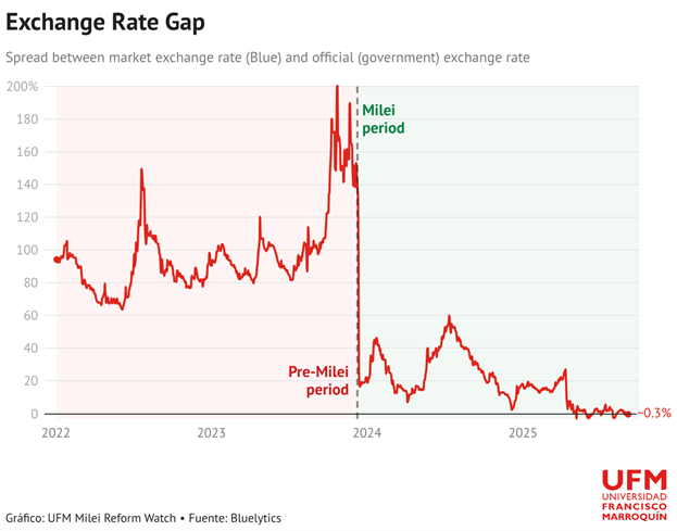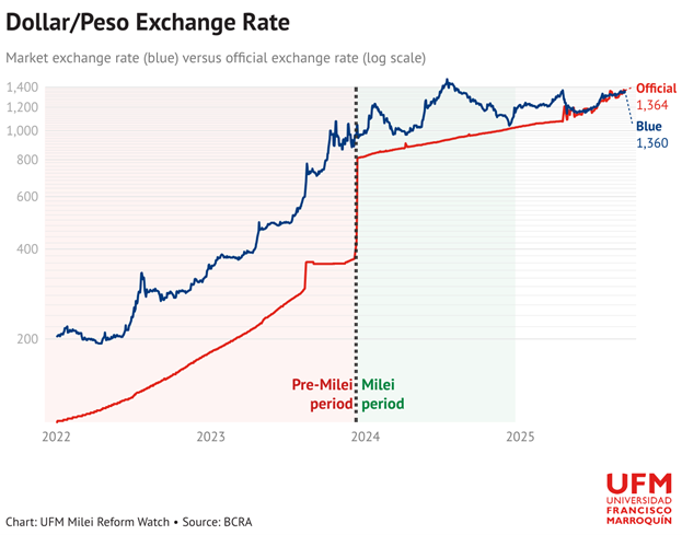 Свою программу рыночных реформ Милей начал с шоковой терапии, предполагавшей отмену валютного контроля, то есть девальвацию, в связи с чем песо и упал по отношению к доллару на 70%, достигнув своей реальной рыночной стоимости, что стало первым шагом на пути потенциальной долларизации. Сам Милей неоднократно заявлял о намерении отказаться от национальной валюты и перейти к полному использованию доллара, по аналогии с Эквадором и Сальвадором. Хотя структурная долларизация пока не реализована, её подготовка продолжается: сокращается прямая эмиссия, усиливается контроль над денежной базой, заморожены трансферты регионам.