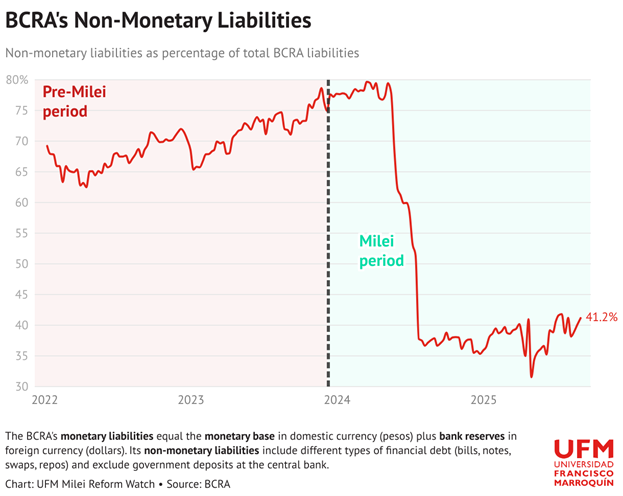 В-третьих, были ликвидированы скрытые обязательства BCRA. Государственные облигации в песо с правом предъявления к погашению в центральном банке (пут-опцион) были отвязаны от этого права с соответствующей компенсацией банкам. Кроме того, Центральный банк выпустил новые облигации для исполнения своих долларовых обязательств перед импортёрами — «Облигации по восстановлению свободной Аргентины» (BOPREAL) — тем самым переведя скрытую задолженность в обычные финансовые рамки. Затем долг ЦБ частично сократили за счёт сформированных бюджетных профицитов.