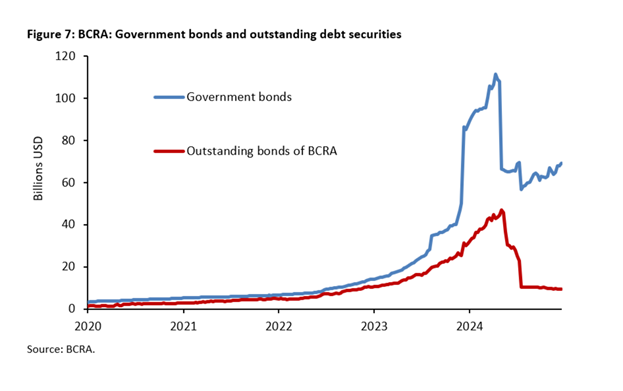 Сокращение выпуска гособлигаций, доходность по которым в самом деле достигла каких-то астрономических значений в последние месяцы, также является частью политики администрации Милея. Во-первых, давление на Центральный банк по покупке государственных облигаций было снято за счёт сокращения государственных расходов и вывода бюджета в профицит. В результате портфель гособлигаций у Центрального банка, который продолжал расти в течение 2023 года, в 2024-м был сокращён: на конец 2024 года объём составил 68 млрд долл. США против 111 млрд в апреле 2024 года. Во-вторых, правительство сократило объём обращающихся облигаций Центрального банка, из-за которых на BCRA ложилась высокая и трудноуправляемая процентная нагрузка. Объём этих бумаг уменьшился с 46 млрд долл. США в мае 2024 года до менее чем 10 млрд долл. США к концу 2024-го, в том числе за счёт бюджетных профицитов.
