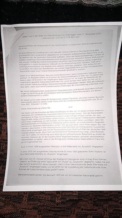 Немецкие же чиновники без каких-либо причин ставят под сомнение подлинность документов, для получения которых заявителям уже пришлось в судебном порядке подтверждать своё родство с этническими немцами и национальное происхождение. Могут запросить документы, которые законным способом получить невозможно, например, копию листа из книги актовой записи и так далее.