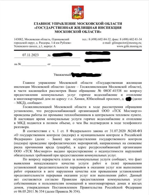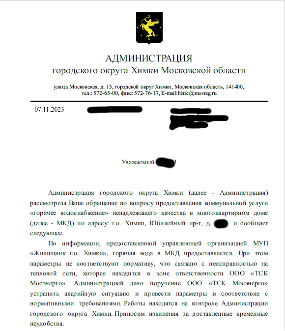 О проблеме жильцы регулярно сообщали местным правительственным органам электронными письмами, звонками в администрацию города, «Мосэнерго», «Жилищник», администрацию Московской области. Было проведено несколько встреч. Но чиновники предпочли перекладывать ответственность друг на друга и продолжили присылать отписки о якобы проведённых работах и выданных коммунальщикам «предостережениях».