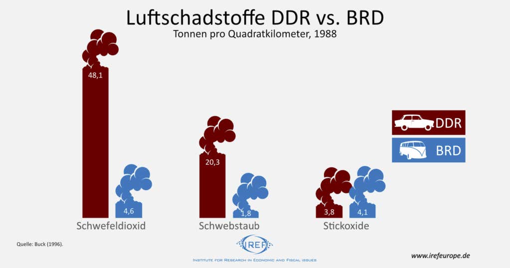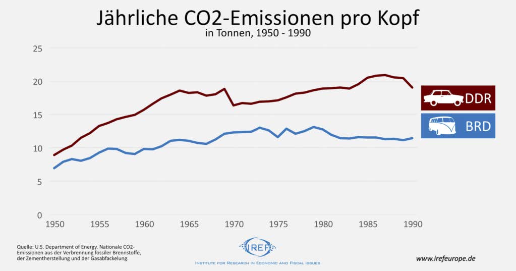 Абсурд, но согласно данным Министерство энергетики США, хотя в 1950 году выбросы на душу населения в двух Германиях все еще были довольно близки друг к другу, со временем эмиссия CO₂ в ГДР росла сильнее, чем в Западной Германии, а в 1990 году на душу населения в Западной Германии выбрасывалось чуть менее 11,5 тонн CO₂, когда в Восточной Германии — более 19 тонн CO₂ в год. Если считать выбросы по отношению к валовому внутреннему продукту, результат ГДР выглядит еще более удручающим. В 1989 г. на каждый пункт ВВП в ГДР было выброшено более чем в три раза больше CO₂, чем в ФРГ.